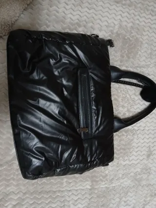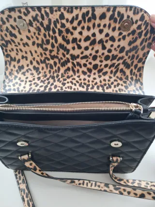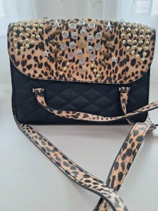 Bolso de la marca Guess con un diseño llamativo. - Acabado en negro y estampado animal. - Detalles de tachuelas doradas y plateadas. - Correa ajustable con estampado. - Medidas aproximadas: 20x15 cm.