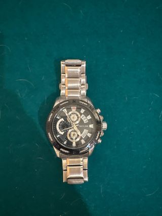 Elegante reloj con correa de metal y esfera oscura. - Diseño moderno. - Detalles plateados en la esfera y bisel. - Correa de eslabones.