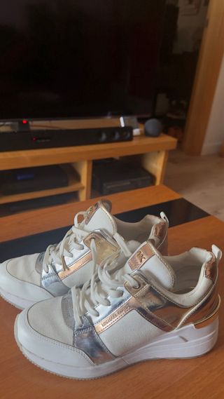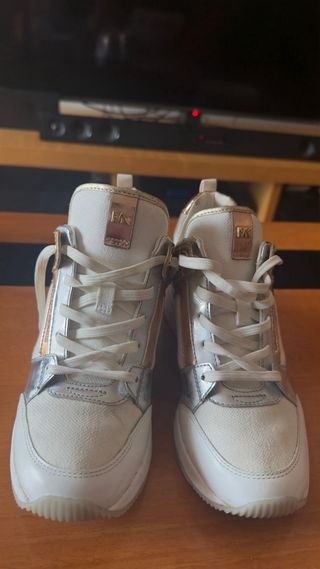 Zapatillas de moda con un diseño moderno y detalles brillantes. - Combinación de blanco y dorado. - Logo de Michael Kors en el lateral. - Excelente estado