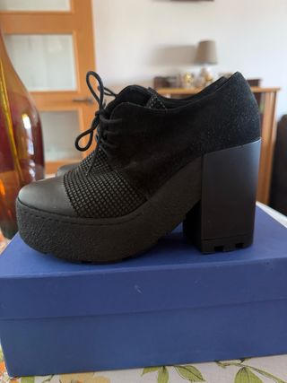 Botines de la marca Vic Matie en color negro. - Diseño con cordones. - Plataforma gruesa. - Tacón cuadrado. - los use dos veces - todo de piel