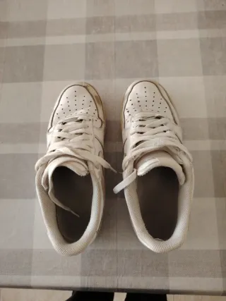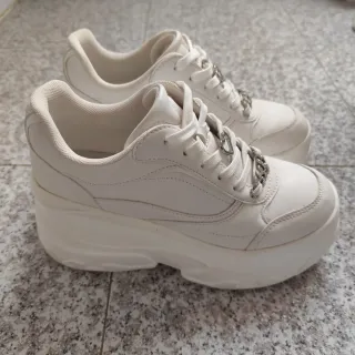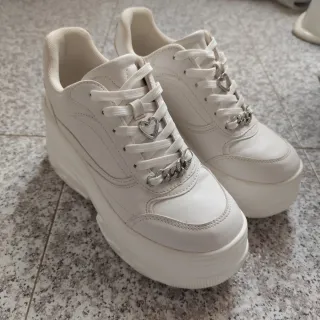Zapatillas deportivas blancas con plataforma alta y detalle de corazón y cadena en los cordones. Solo las he usado una vez, las vendo porque me van grandes pero están en perfectas condiciones.