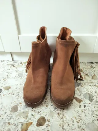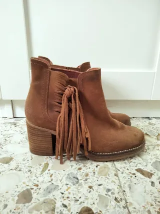 Botines de piel marrón caramelo con tacón bajo y flecos en los costados de la marca Mustang. Talla 39. Buen estado. 80€ originalmente.