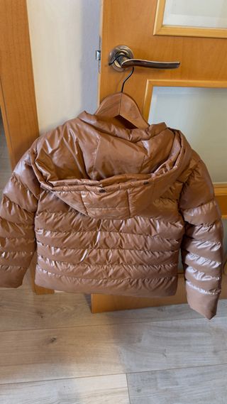 Doudoune con capucha, perfecta para mantenerte abrigado. - Diseño acolchado. - Cierre de cremallera frontal. - Material exterior brillante. - Excelente estado dice talla L pero es muy pequeña