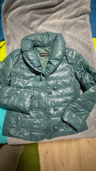 Chaqueta de plumas con cuello alto con cierre y botones. - Diseño brillante. - Excelente estado. - Pequeño detalle en la cremallera pero cierra bien (en la foto se ve ) _Es mas M que L