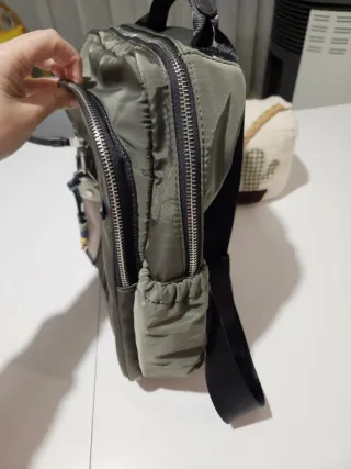 Bolso tipo mochila de la marca Sfera. - Color verde oliva. - Diseño moderno y funcional. - Cierre de cremallera principal. - Bolsillo frontal con cremallera. - Asa de mano y correas ajustables para los hombros. - Detalle de llavero colgante.