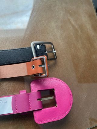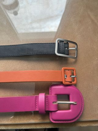 Conjunto de tres cinturones de 105 cm de largo. El rosa y anaranjado nunca usados, el gris usado una única vez, se puede ver en las fotos el buen estado. Marca Lefties el rosa y local los otros dos - Un cinturón negro. - Un cinturón naranja marrón - Un cinturón rosa.
