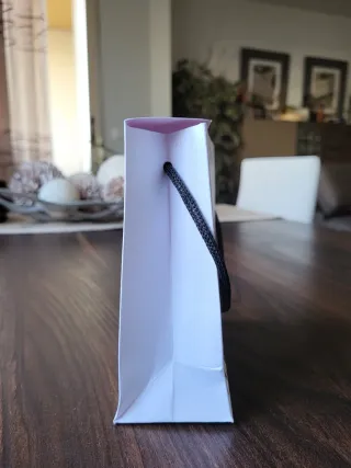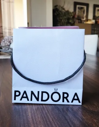 Bolsa original blanca de Pandora, interior en rosa. Ideal para envolver regalos de abalorios, colgantes, pulseras, cuentas, collares o pendientes. Con asa para transportar fácilmente. Un solo uso, en perfecto estado. Dimensiones 14x14x6cm.