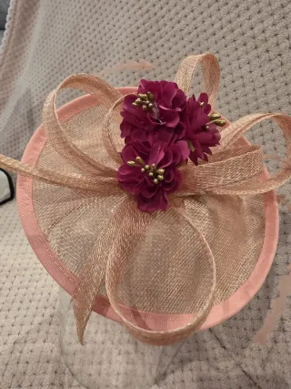 Elegante tocado para ceremonias, ideal para madrinas e invitadas. Presenta un diseño con flores y cintas. - Base de sinamay. - Adornado con flores moradas. - Detalles en cinta rosa y dorada.