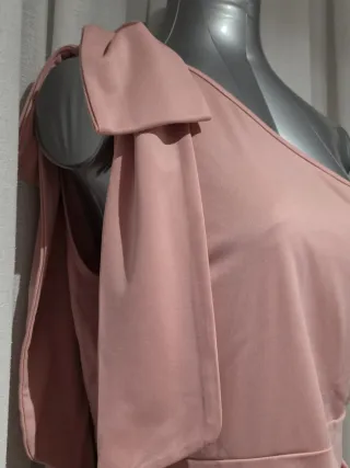 Vestido de cóctel elegante de color rosa. - Diseño de un solo hombro. - Detalle de lazo en el hombro. - Corte ceñido. - Drapeado en la cintura.