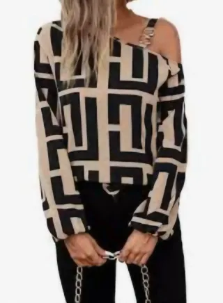Elegante blusa con un diseño geométrico llamativo. - Hombro al aire. - Manga larga. - Combinación de colores beige y negro.