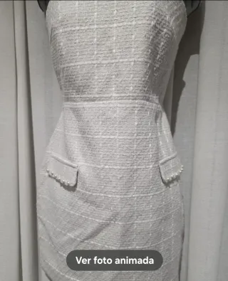 Vestido corto con tela tipo Trench en color blanco roto. Presenta un diseño elegante con detalles de perlas en los bolsillos. - Tejido texturizado. - Adorno de perlas en los bolsillos.