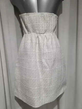 Elegante vestido de fiesta con un diseño de volantes. - Tejido satinado. - Diseño sin tirantes. - Cintura marcada con fajín. - comprado en El Corte Inglés - usado solo una vez