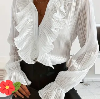 Elegante blusa con un diseño de volantes y un sutil hilo brillante. - Cuello con volantes. - Mangas largas con puños fruncidos. - Cierre de botones.