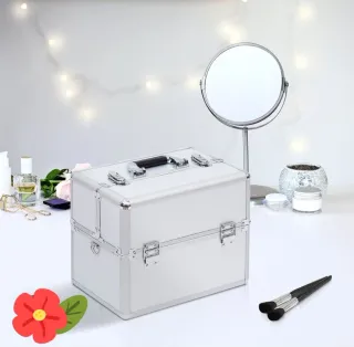Maletín profesional para organizar y transportar maquillaje. Su diseño es elegante y funcional. - Material resistente de aluminio. - Asa superior para fácil agarre. - Cierres de seguridad. - Interior espacioso.