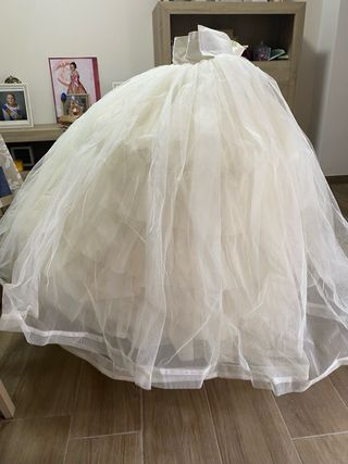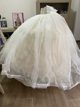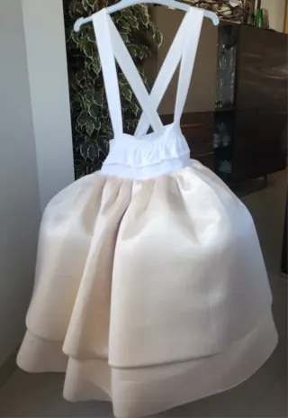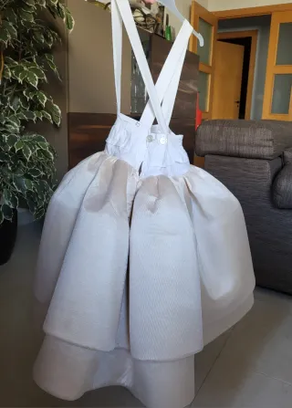 Cancán para traje regional, fallera de fallas de Valencia, reina de la magdalena de Castellón, bellea de las hogueras de Alicante, etc. 45cm largo de la falda color beige. Cuerpo blanco con tirantes ajustables cruzados a la espalda. Cintura se cierra por botones que se pueden mover y coser para ajustarlo al cuerpo de la niña. Dos varillas o aros para mayor volumen. Ideal para cualquier ocasión y como repuesto. Usado, con signos del uso pero en muy buen estado.