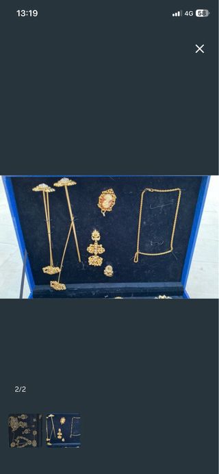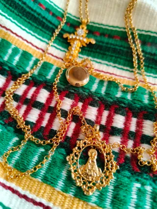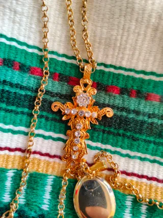 Precioso relicario de fallera con un diseño intrincado y detalles dorados. Compuesto por tres piezas: cruz, guardapelo y virgen de los desamparados. - Acabado en oro. - Diseño ovalado con figura central. - Cadena a juego. Aderezo
