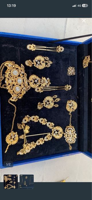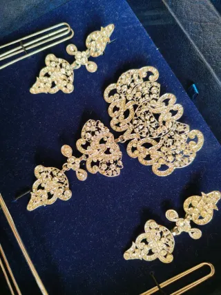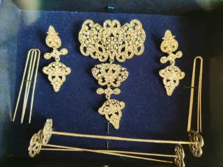 Precioso conjunto de aderezo fallero con un diseño intrincado y brillante. - Piezas con incrustaciones de pedrería. - Acabado en tonos plateados.