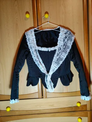 Corpiño de fallera con un diseño elegante. Talla 46 (talla pequeño, será para una 42 aprox) Se vende SIN peinador, en caso de querer peinador consultar. - Adornado con encaje blanco. - Mangas largas con detalle de encaje.