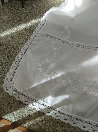 Manteleta de huertana con un diseño delicado y elegante. Perfecta para complementar trajes regionales. - Adornada con encaje fino. - Bordados florales. - Tejido ligero y vaporoso.