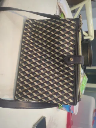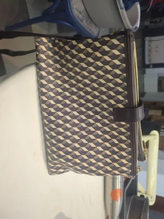 Bolso con un diseño geométrico en tonos beige y marrón. Cuenta con una correa para llevar al hombro. - Cierre de cremallera. - Detalle de botón en la parte frontal.