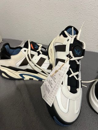 Zapatillas deportivas nuevas a estrenar Adidas Niteball en tonos blanco, azul y negro. Un diseño moderno y cómodo. Se venden por error de talla y no poder devolver. - Cierre de cordones. - Suela de goma. - Detalle de las tres bandas y logo en lengüeta con velcro.