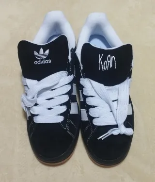 Zapatillas deportivas Adidas con un diseño único. - Color principal negro con detalles blancos. - Logo de Adidas en la lengüeta. - Inscripción Korn bordada en la otra lengüeta.