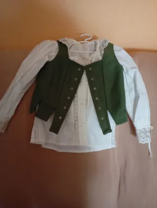 Conjunto de camisa de huertana y chaleco para niña, talla aproximada 4 años. - Camisa blanca con detalles de encaje. - Chaleco verde. - Ideal para trajes regionales.