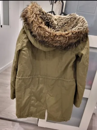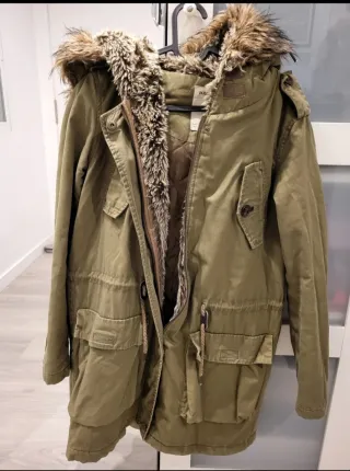 Parka de la marca Pull&Bear en color verde, con capucha forrada de pelo sintético. - Cierre de cremallera y botones. - Bolsillos frontales con solapa. - Cordones ajustables en la cintura. - Forro interior acolchado.