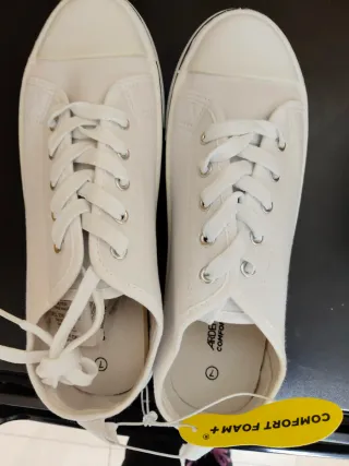 Zapatillas de lona blancas de la marca Ardene. -Sin extrenar - Cierre con cordones. - Suela de goma. - Detalle de etiqueta Comfort Foam+ en la plantilla.