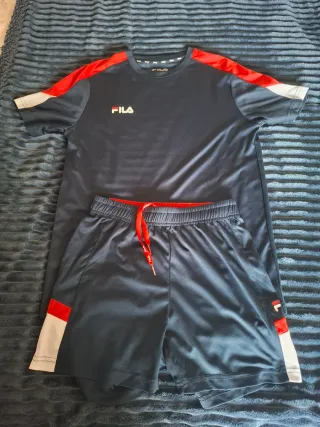 Conjunto deportivo de camiseta y pantalón corto de la marca Fila. - Camiseta de manga corta con detalles en rojo y blanco. - Pantalón corto con cordón ajustable y detalles en rojo y blanco. Talla 14 años, en perfecto estado.