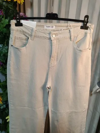 Pantalón vaquero de corte recto en color beige. - Cintura alta. - Cierre de botón y cremallera. - Bolsillos delanteros y traseros.