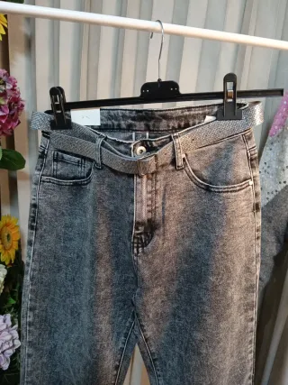 Pantalón vaquero de corte recto con un diseño moderno y un cinturón a juego. - Cinturón con detalles brillantes. - Lavado tipo acid wash o desteñido. - Tiro alto.