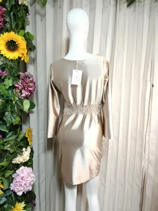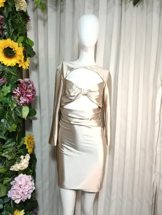 Vestido elegante de color dorado con un diseño moderno. - Tejido satinado brillante. - Detalle de lazo en el pecho. - Escote pronunciado. - Mangas largas.