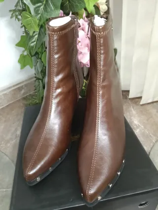 Botas de estilo moderno con un acabado en piel. - Color marrón. - Detalle de tachuelas metálicas en la suela. - Cremallera lateral para facilitar el calce. - Tacón cuadrado.