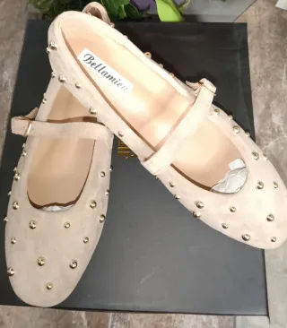 Merceditas de la marca Bellamica en color beige, adornadas con tachuelas doradas. - Diseño elegante con tira y hebilla. - Acabado tipo ante.