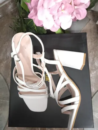 Elegantes sandalias blancas con tacón grueso y tiras finas. - Cierre de hebilla. - Tacón cuadrado. - Diseño abierto.