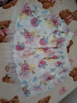 Preciosa falda para niña con un estampado alegre y primaveral. - Diseño con flores y mariposas. - Volante de tul en el bajo. - Tejido ligero y vaporoso.