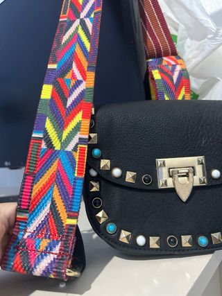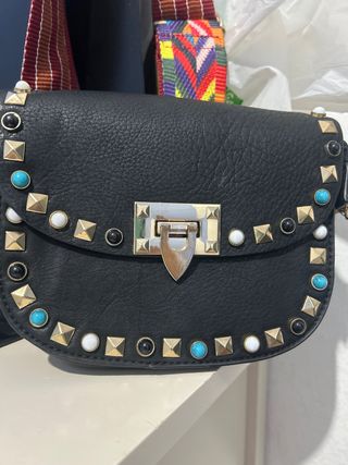 Bolso negro con un diseño llamativo, adornado con tachuelas doradas y piedras decorativas en tonos blanco y turquesa. Cierre metálico. - Tachuelas doradas. - Piedras decorativas (blanco y turquesa). - Cierre de seguridad metálico.