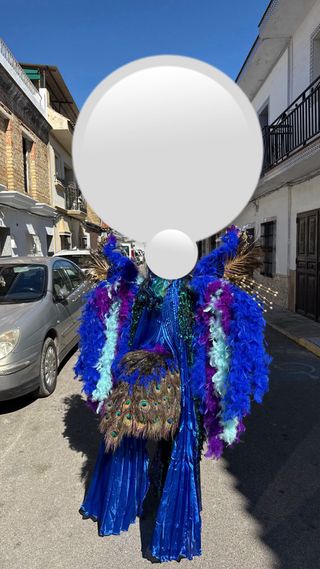 Impresionante disfraz de pavo real, perfecto para carnavales o fiestas temáticas. Destaca por su elaborada confección y llamativos detalles. - Diseño inspirado en la majestuosidad del pavo real. - Adornado con plumas y lentejuelas. - Incluye tocado y alas. - Cinturón decorativo con jaula.