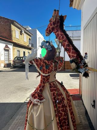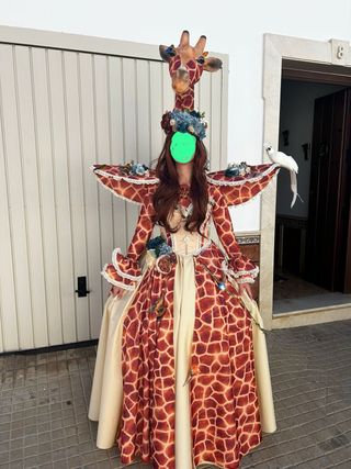 Original disfraz de jirafa, ideal para fiestas de disfraces o carnaval. Destaca por su diseño único y llamativo. - Vestido largo con estampado de jirafa. - Adornos florales y de pájaros. - Cabeza de jirafa como tocado.