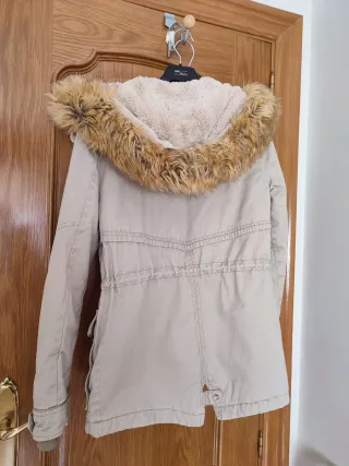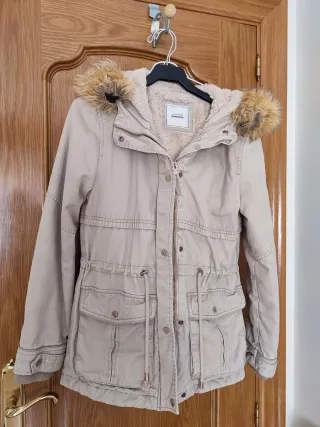 Abrigo tipo chaquetón de la marca Pimkie, perfecto para el frío. - Forro interior completo de borrego. - Capucha con pelo. - Cintura ajustable con cordón. - Bolsillos frontales con solapa.