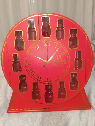 Calendario de Adviento con mini colonias de Mercadona. - Diseño en forma de reloj. - Decoración dorada. - Contiene 12 compartimentos. Esta nuevo sólo un regalo original le compras las colonias por separado y es grande y muy bonito