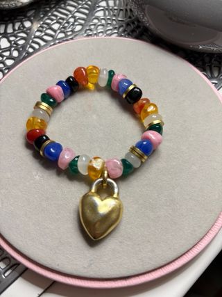 Pulsera elástica de la marca Bimba y Lola con un diseño vibrante y un charm de corazón. - Cuentas de diferentes colores y formas. - Detalle de anillas doradas entre las cuentas. - Charm en forma de corazón dorado.