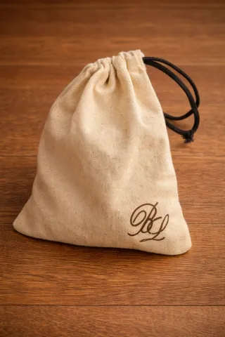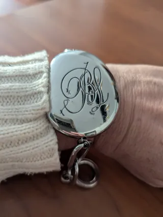 Pulsera con diseño de iniciales entrelazadas. - Cierre de tipo T, el aro está un poco picado en la parte interior (ver foto) - Cordones de algodón encerado en color azul marino, buen estado. - Detalle metálico plateado, mínimamente rozado en el borde inferior (ver foto)