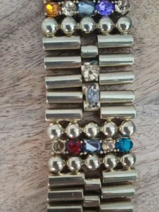 Elegante pulsera de la marca Bimba y Lola. - Diseño con detalles en varios colores. - Acabado en tono dorado. -Le falta una piedrecita negra, a penas perceptible ya que esta proximo al cierre. -Contemplado en el precio. -18 cm de larga aprox.