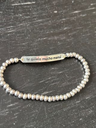 Preciosa pulsera de cuentas plateadas con una placa grabada con la frase "Te quiero mucho mamá". Es una pulsera delicada y elegante, perfecta para regalar o para uso personal. - Material: cuentas plateadas - Incluye una placa con frase grabada