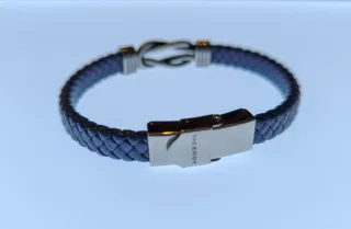 Pulsera de cuero trenzado en tono azul con detalles plateados y cierre de seguridad. - Diseño con nudo marinero. - Acabados en acero inoxidable.