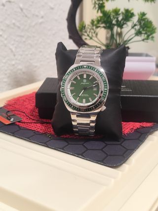 Reloj de pulsera para hombre con un diseño moderno y elegante. - Esfera de color verde vibrante. - Correa y caja de acero inoxidable plateado. - Bisel giratorio con marcadores. - Ventana de fecha en la esfera.
