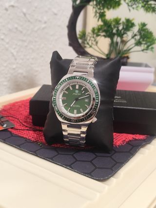 Vendo reloj BENYAR para hombre. Es un reloj de pulsera elegante y moderno. - Diseño de cronógrafo. - Correa de acero inoxidable. - Esfera verde con detalles en plateado. - Caja incluida.