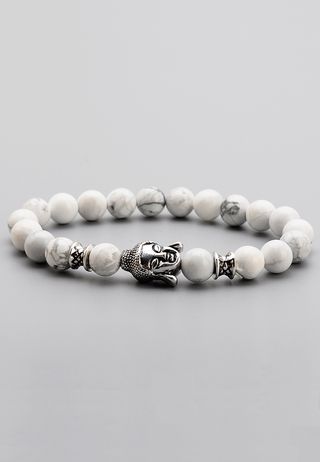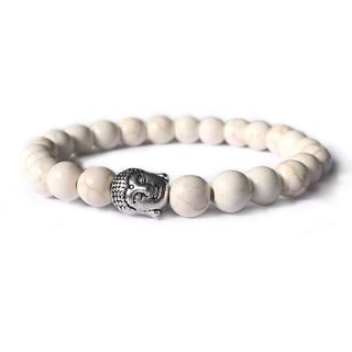 Elegante pulsera con cuentas de Howlita blanca y un detalle central de Buda en acero inoxidable. - Diseño moderno y minimalista. - Cuentas de Howlita natural. - Detalle de Buda en acero inoxidable.